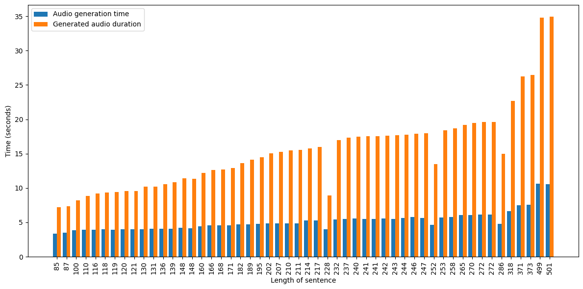 Fig 2: Plot between time taken to generate the audio and the duration of the generated audio. X-axis denotes the length of the texts and Y-axis denotes time in seconds.