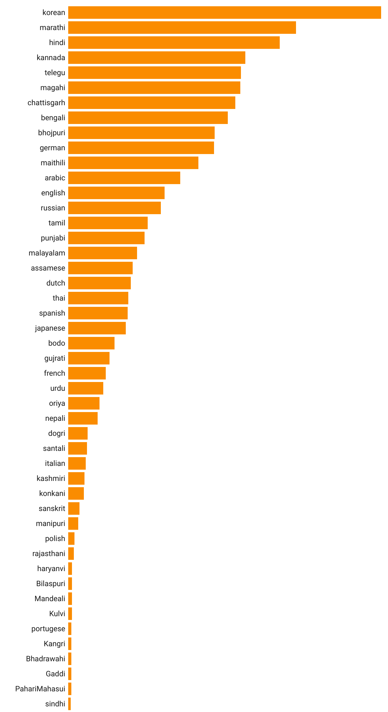 The first version of the model involves expanding the number of languages along with the training data. Fig 1. denotes the languages along with the number of hours used for each language. In total the model was trained on 2200 hours of audio data from publicly avilable sources.